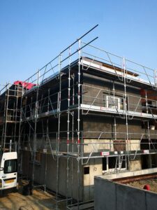 Travaux sur les façades extérieures avec la pose du bardage et la mise en place de l'isolation.